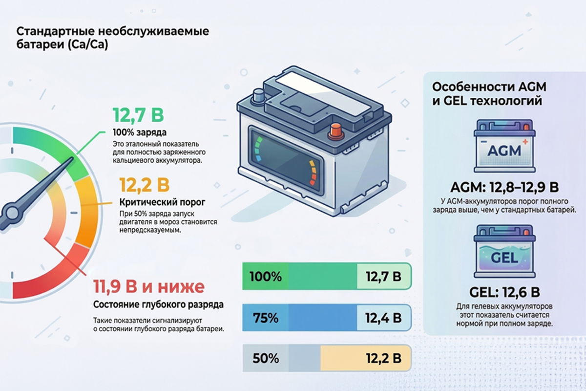 Для AGM-аккумуляторов порог полного заряда обычно выше — около 12,8–12,9 В, в то время как для GEL-технологий нормой считается 12,6 В.
