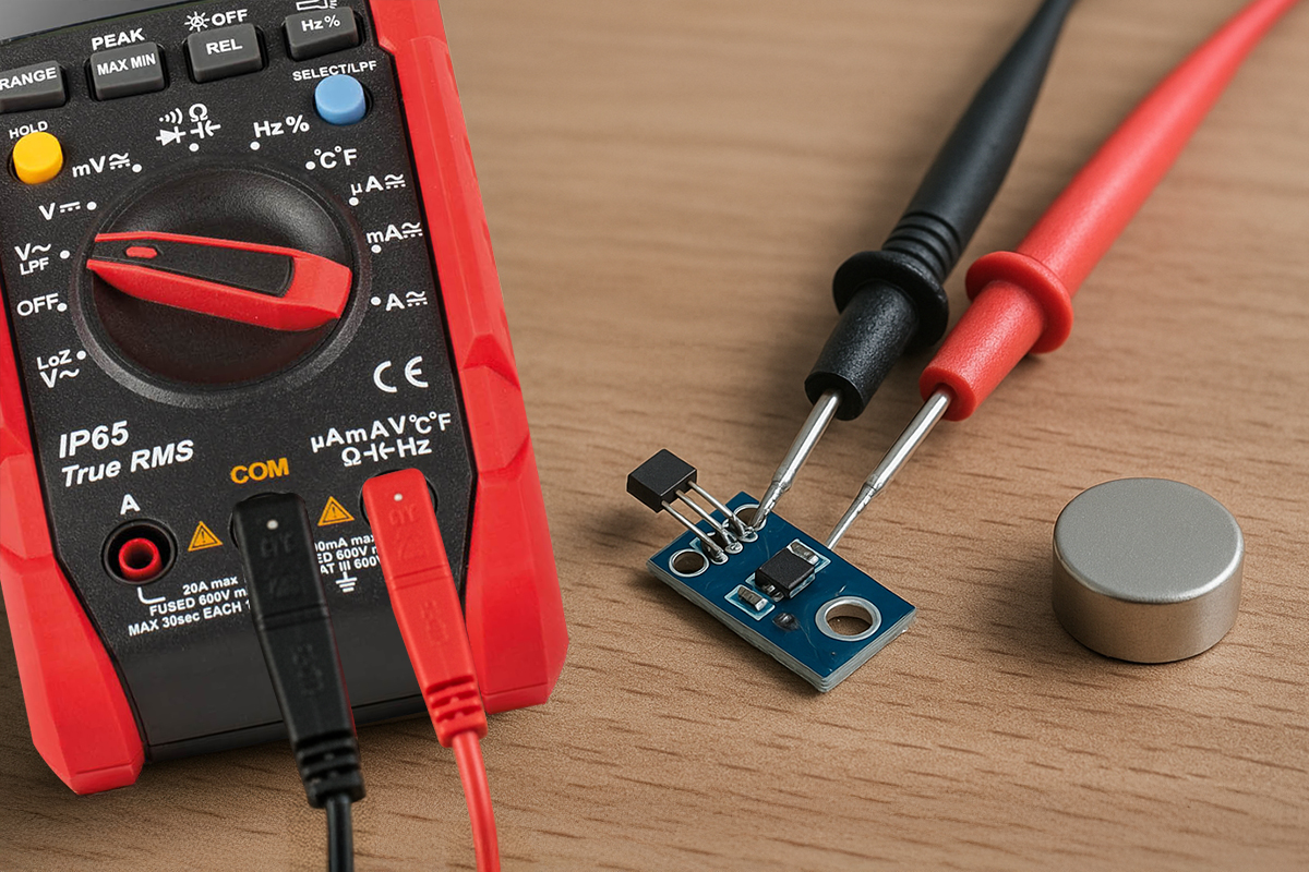 - Активация магнитом: Медленно поднесите и удалите постоянный магнит к чувствительной стороне датчика. Наблюдайте за показаниями на дисплее мультиметра.