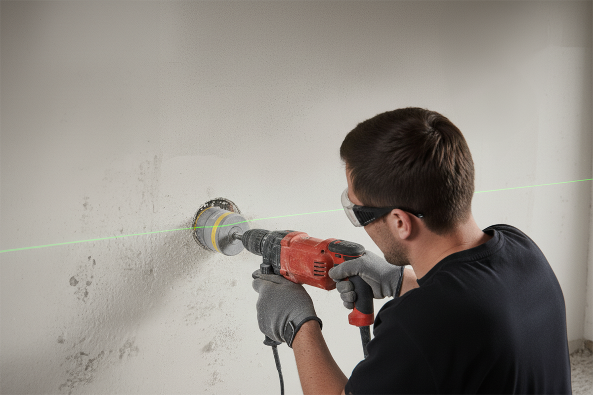 Начните с разметки и подготовки места под монтаж. С помощью лазерного уровня отметьте центр будущего подрозетника на высоте 90–100 см от пола и примерно в 10–15 см от дверного наличника — так выключатель будет располагаться на удобной высоте и в нужной зоне.