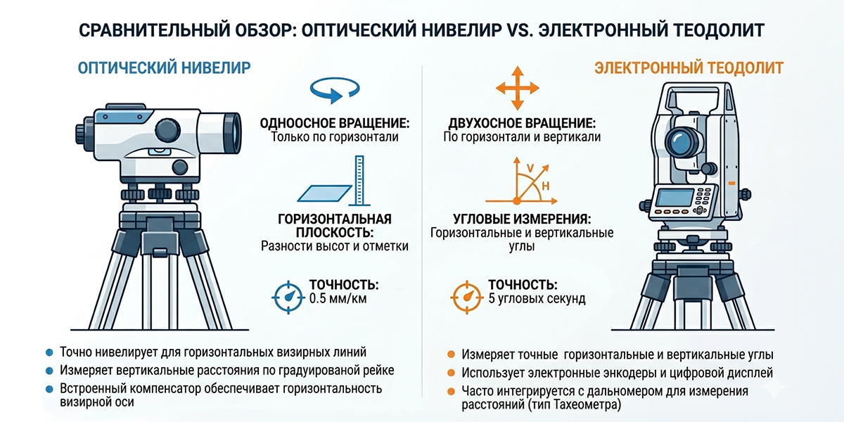 Это сделано намеренно, чтобы исключить случайный наклон луча и гарантировать точность высотных отметок. У теодолита же труба обладает двумя степенями свободы: она вращается не только вокруг вертикальной оси (азимут), но и может качаться вверх-вниз, позволяя измерять углы наклона объектов относительно горизонта.