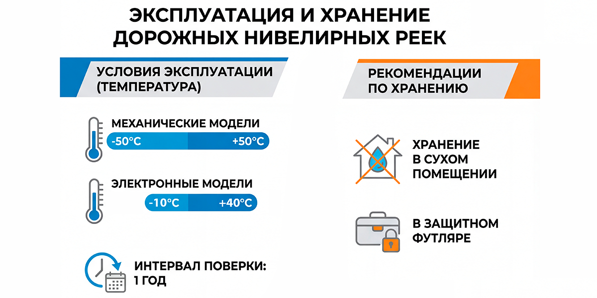 Важным параметром является межповерочный интервал для дорожных реек, который составляет 1 год. Даже если прибор выглядит исправным, по истечении этого срока он формально перестает быть средством измерения и превращается в обычную строительную линейку, данные которой не имеют юридической силы при возникновении споров.