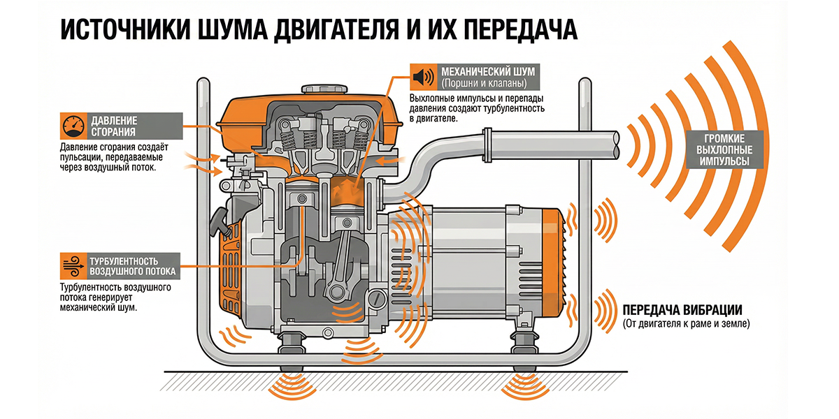 Прежде чем бороться с шумом, важно понять, откуда он берется. К сожалению, бесшумных двигателей внутреннего сгорания пока не изобрели, и любой работающий агрегат будет напоминать о себе. Общий фон складывается из двух ключевых факторов: