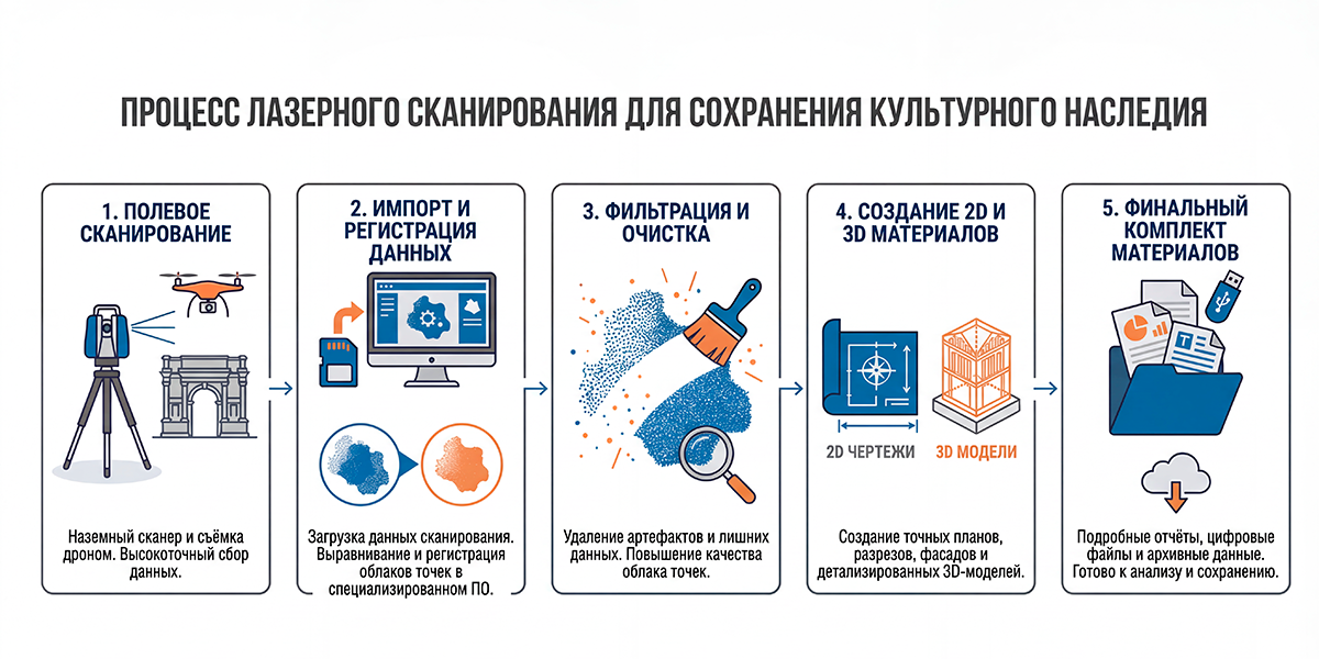 Лазерное сканирование объектов культурного наследия — это бесконтактный метод создания высокоточных цифровых копий зданий и памятников. Он применяется для подготовки проектов реставрации, мониторинга деформаций и создания виртуальных архивов. Заказчик получает исчерпывающие данные о геометрии объекта в виде облака точек, 3D-моделей или подробных чертежей, что сокращает сроки проектирования и исключает ошибки ручных измерений.